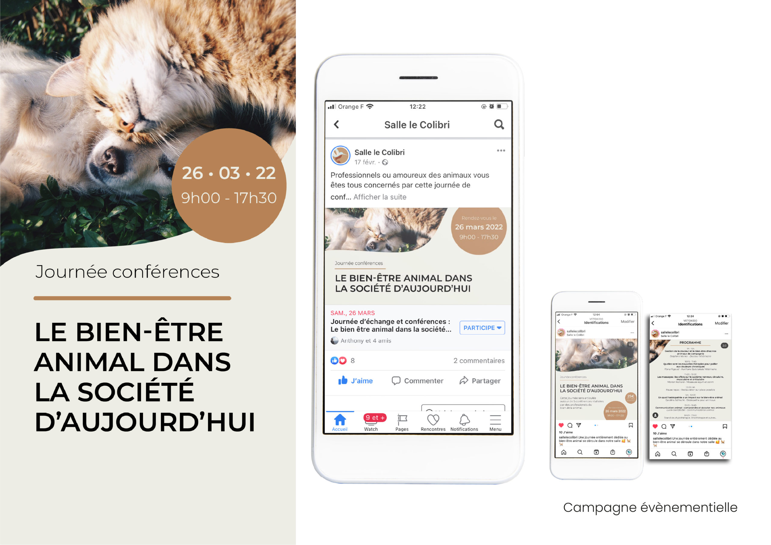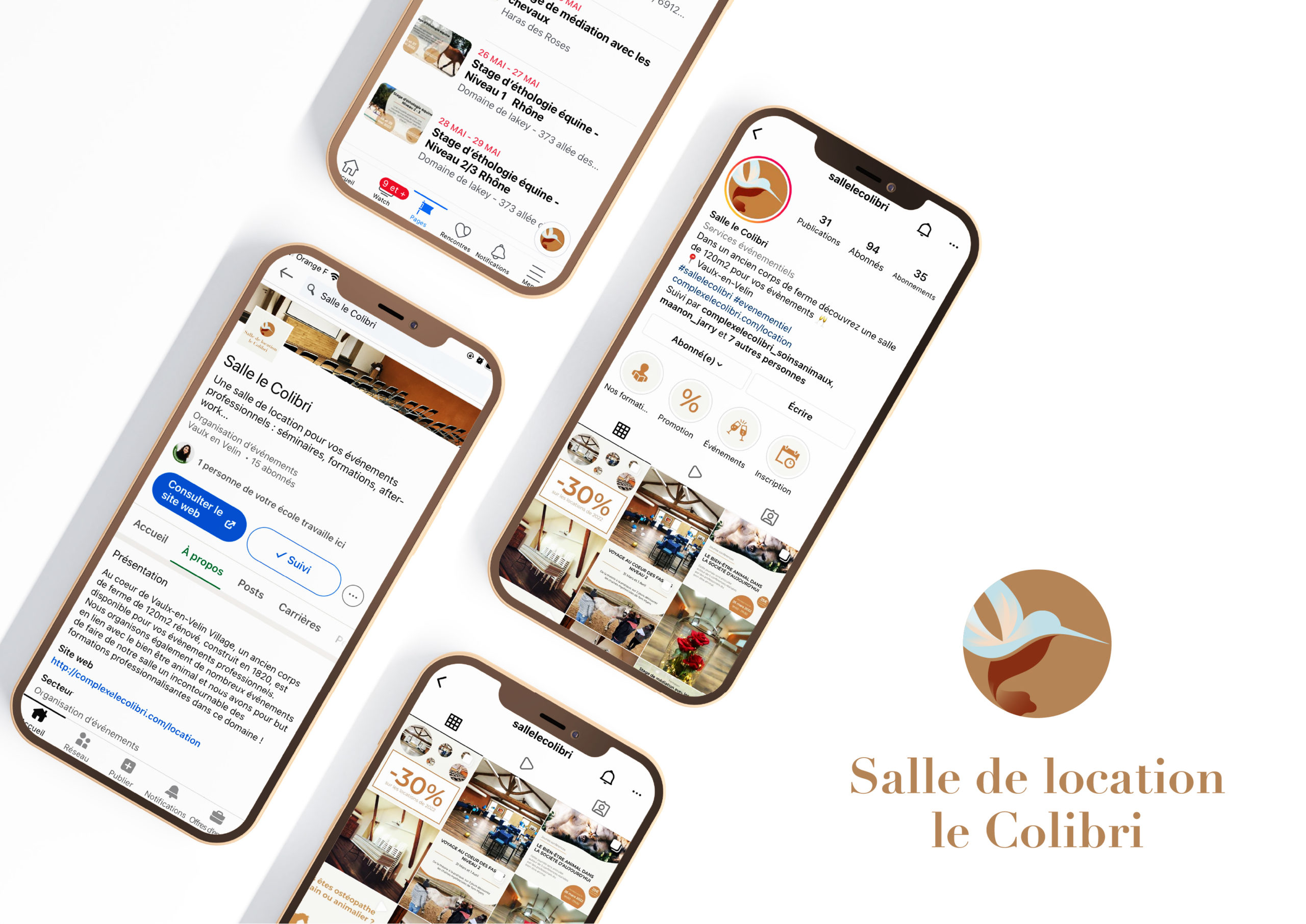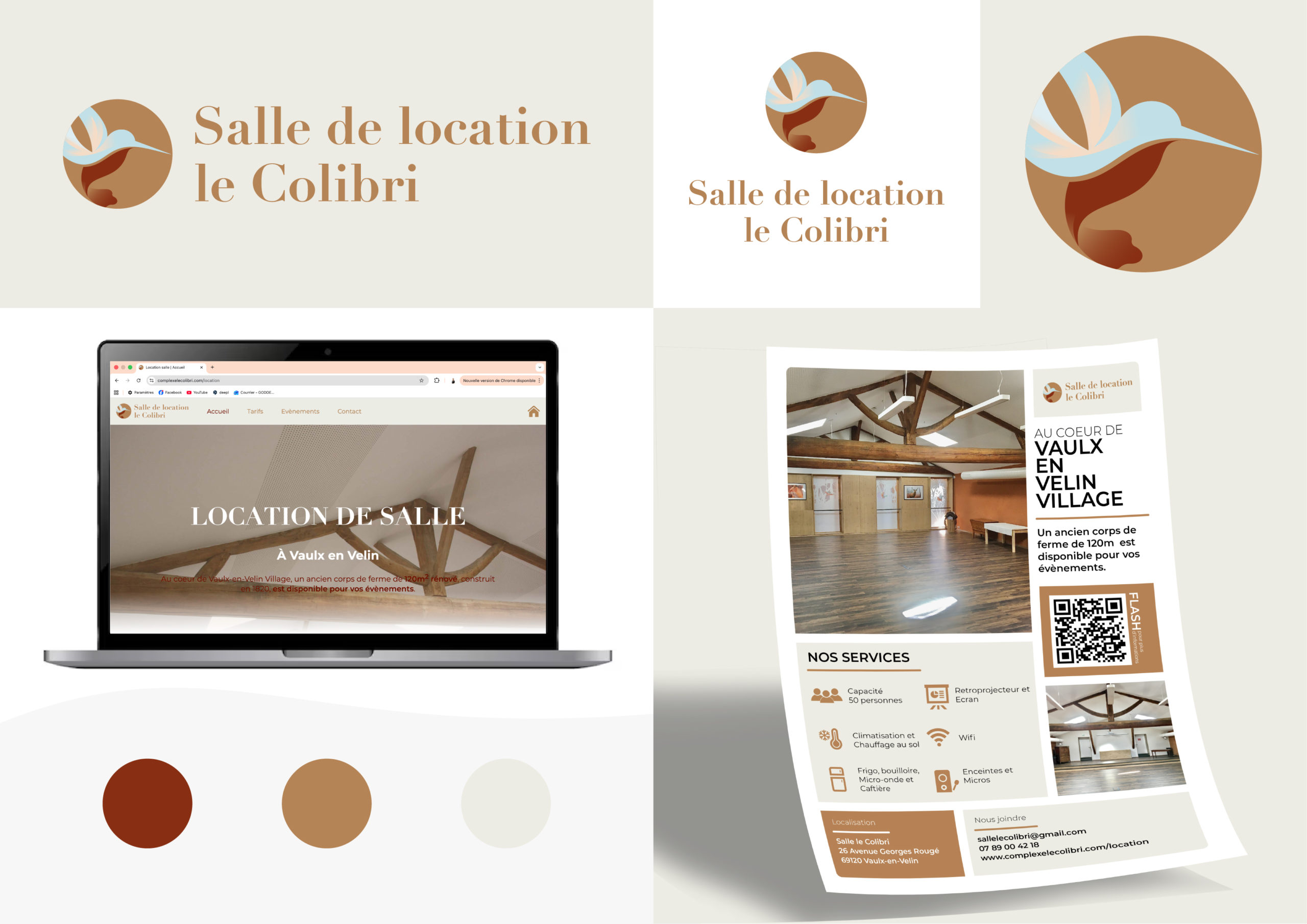 Pour l’entreprise mère Complexe le Colibri, j’ai conçu la direction artistique de la Salle de location Le Colibri afin de refléter un lieu chaleureux, naturel et accueillant. L’identité visuelle s’appuie sur des formes organiques, une palette de tons doux et terreux ainsi qu’une typographie élégante, en écho à l’authenticité du lieu. J’ai également pris en charge la création du site internet et des supports de communication, assurant une cohérence globale entre l’image de marque, la présence digitale et la communication print.